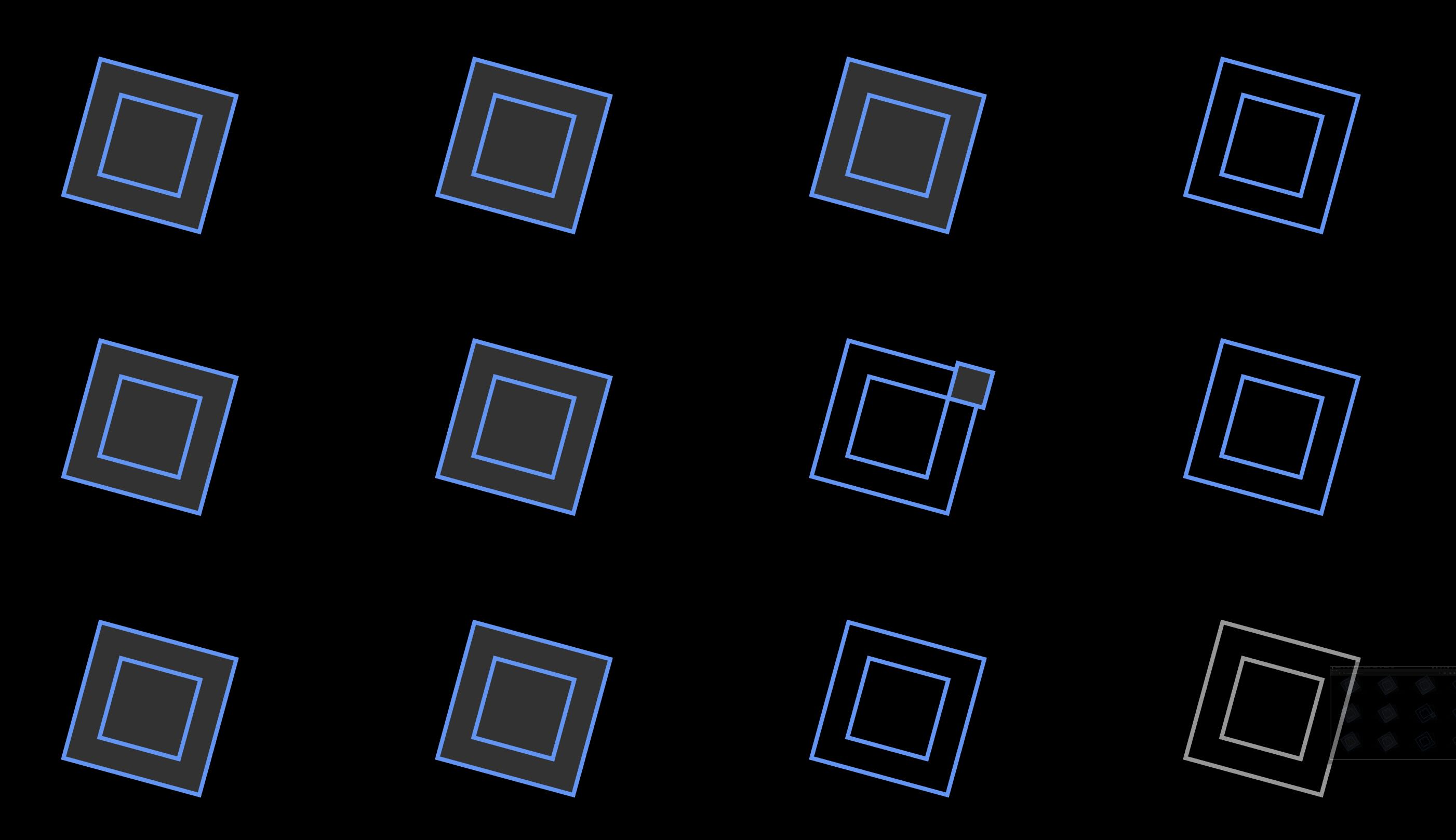 I then decided to use twelve blocks in a grid to represent time similarly to an analog clock. I decided that outlines would represent hours and shading would represent minutes, since those were the clearest two features I could edit on the block. I could also add up to four smaller blocks on one of the larger blocks to represent individual minutes (while the larger blocks represented multiples of five). Since the blocks were square, adding up to four smaller blocks could be done at each of the square's four corners. Lastly, seconds could be represented with an animation where each large square is "filled up" by a smaller square every minute.