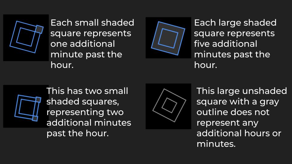 Like the minute hand on an analog clock, this clock uses multiples of five to represent minutes. The number of large squares with fully shaded gray interiors multiplied by five is the approximate current minute count. Then, to get the exact minute, there are smaller gray squares, each representing one additional minute. For example, at 12:23, there are 4 large gray-shaded squares (4 * 5 = 20 minutes) and 3 small gray-shaded squares. Therefore, we have 20 minutes from large squares and 3 minutes from small squares, for a total of 23 minutes past the hour.