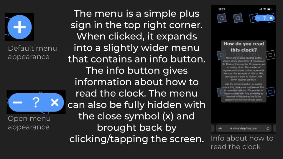 Once I had implemented those features and added a few additional features to make the transitions smoother, the clock was complete. I then added a simple, non-intrusive menu with information about how to read the clock.