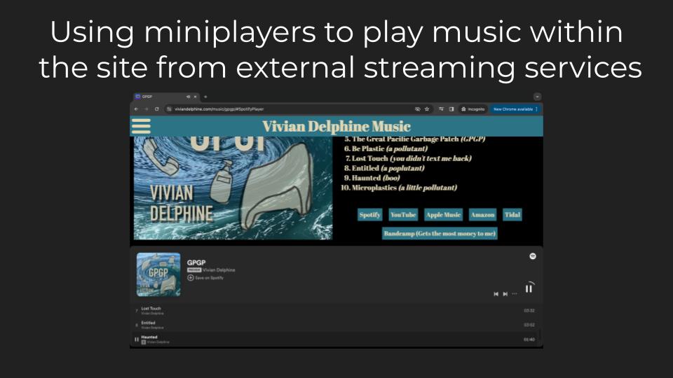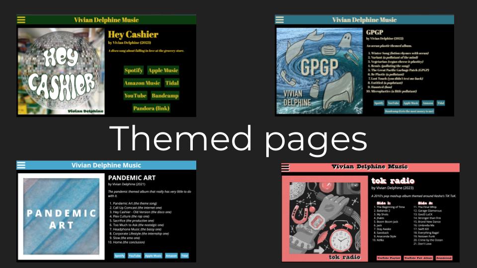 In this project, I decided to focus more on using CSS than relying on JavaScript. I created a grid of my four musical projects and then created a themed landing page for each album, using matching colors and fonts where possible. I then included a miniplayer for each streaming service so that the user can listen to the music while staying on the site.